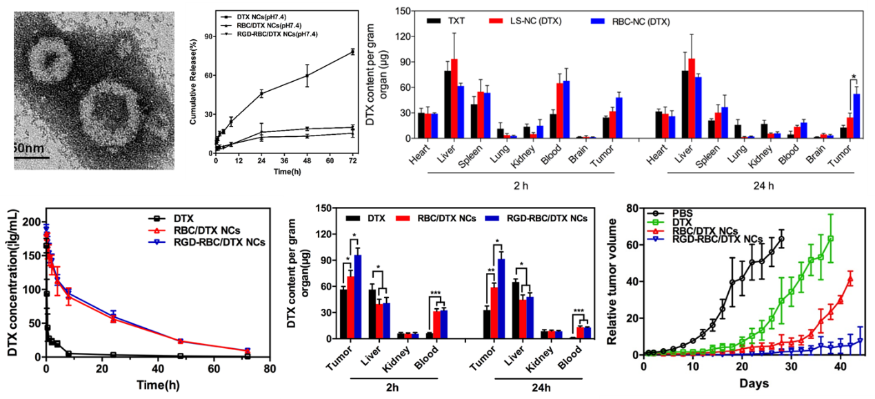 Chemotherapy drugs were prepared into nanocrystals and incubated with erythrocyte vesicles containing Streptavidin PEG phospholipid material, so that drug nanocrystals were inserted into the erythrocyte membrane of Streptavidin, and then incubated with biotinylation RGD. Through the affinity between biotin and avidin, RGD was modified to the surface of erythrocyte membrane to obtain RGD modified erythrocyte membrane coated drug nanocrystals. The research results show that (Figure 2), the RGD modified erythrocyte membrane coated with drug nanocrystals shows that it has an obvious nuclear membrane structure, and its stability is significantly improved; In vivo pharmacokinetics indicates that biofilm coated drug nanocrystals have the advantage of long circulation, significantly prolonging the drug's circulation time in the body; By using the target molecule modification strategy of Streptomyces avidin, the electrostatic interaction between positively charged RGD peptides and negatively charged red blood cell membranes was shielded, resulting in a good tumor targeting effect; Meanwhile, due to the significant increase in drug loading caused by the use of drug nanocrystals as skeleton materials, significant therapeutic effects were achieved in a single dose.